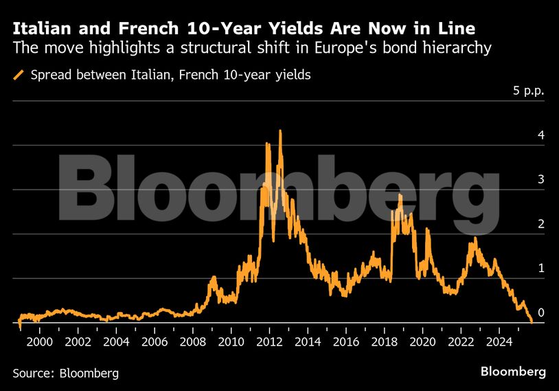 Τα spreads των 10ετών ιταλικών ομολόγων σε σχέση με τα γερμανικά βρίσκονται κοντά στις 80 μονάδες βάσης, λιγότερο από το ένα τρίτο των επιπέδων όταν ανέλαβε η Μελόνι το 2022.