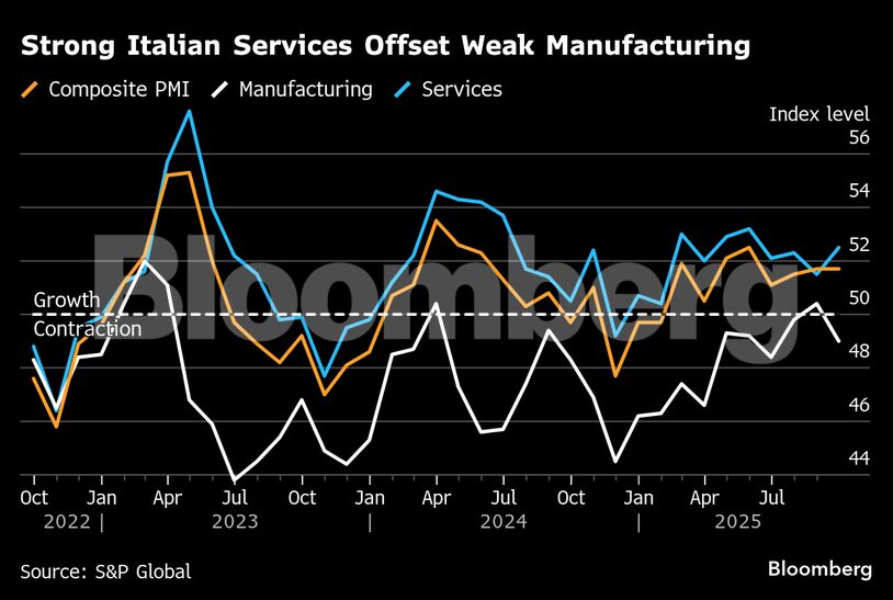 Οι πρόσφατοι δείκτες PMI αποκάλυψαν μια «εικόνα απόκλισης» για τον ιδιωτικό τομέα. Ενώ ο συνολικός δείκτης παρέμεινε σταθερός, οι υπηρεσίες κατέγραψαν το υψηλότερο επίπεδο από τον Μάιο, αντισταθμίζοντας τη συνεχιζόμενη κάμψη της μεταποίησης.